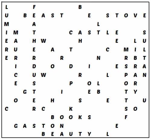 Solutions to the Beauty and the Beast Wordsearch on this site.