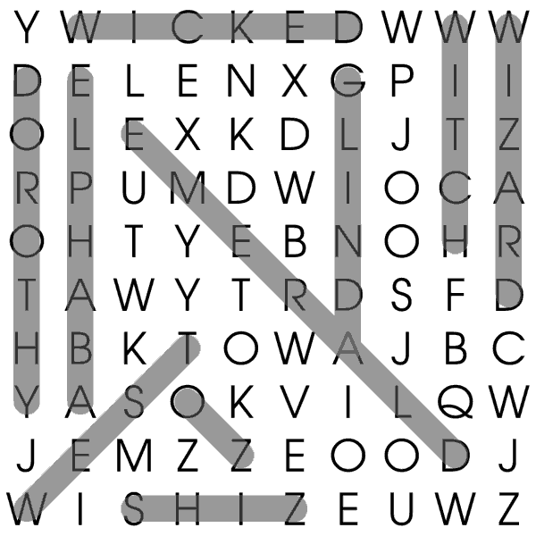 Here is the solution to the Wicked-themed wordsearches on this website.